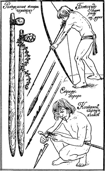 Музей антропологии и этнографии имени Петра Великого (когда-то он назывался Кунсткамерой) – один из интереснейших в Ленинграде. В нем собраны и этнографические коллекции из Южной Америки. Ежедневно сотни посетителей проходят мимо экспозиции, не скрывая удивления от увиденного. Легко заметить, что терка, на которой женщина растирает съедобный клубень, или лук в руках индейца, бьющего рыбу, привлекают меньше внимания, чем фантастический наряд из перьев, панцирей черепах и скорлупы орехов на теле шамана и особенно ботоки – огромные деревянные диски в мочках ушей и в губе мужчины из племени ботокудо. В старинных русских описаниях индейцев Аляски похожие диски именуются калужками.