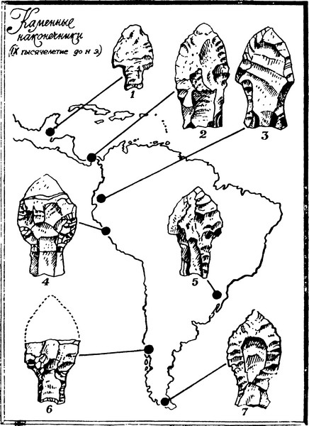 Мифы о потопе встречаются у большинства народов мира, поэтому наличие подобного мотива как у тукано, так и у яганов само по себе ни о чем не говорит. Однако конкретная трактовка эпизодов, их набор и последовательность в преданиях о свержении власти женщин в Северо-Западной Амазонии и на Огненной Земле совершенно уникальны. Нельзя исключать, что это сходство вызвано древними связями, восходящими к эпохе заселения континента, когда на территорию Южной Америки с севера через Панамский перешеек проникли группы охотников. Одни из них остались в пределах современной Колумбии, другие стали двигаться на юг, пока не достигли Огненной Земли. В IX тысячелетии до н. э. на северо-западе, западе и юге Южной Америки распространяются оригинальные по форме каменные наконечники дротиков, явно свидетельствующие о близком родстве изготовлявших их групп индейцев. Нижняя часть таких наконечников напоминает рыбий хвост и часто имеет продольный желобок. В VIII–VII тысячелетиях до н. э. в Андах, Панаме, Патагонии и на Огненной Земле распространяются наконечники иного типа, листовидные, но двусторонняя техника их обработки остается. Культурная общность племен, живших в то время вдоль всего западного края южноамериканского континента, возникла не случайно. Это были районы, богатые горными и степными пастбищами, где водились несметные стада травоядных животных, прежде всего гуанако. Наконечники описанных типов были оружием охотников, восточные же районы Южной Америки покрывали тропические леса и саванны, дичи там было гораздо меньше, хозяйство местных индейцев – неспециализированное, а употреблявшиеся каменные орудия – другие, чем на западе.