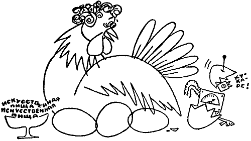 Искусственные продукты уже входят в нашу жизнь. Где-то «сделали» черную икру. Очень кстати, ибо гидрогиганты перегородили реки, и осетрам ничего не остается, как уступить право на фабрикацию икры нам. Хорошо бы еще освоить производство искусственной воблы: не идет ли дело к тому, что нашим потомкам будут демонстрировать ее только в аквариумах зоопарков?