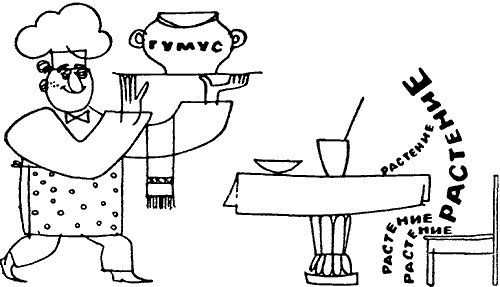 Из всего этого и состоят питательные бульоны, которые пьют растения. Значит, чтобы попасть на стол к растению, перечисленные вещества должны быть соответственным образом приготовлены. Воздух и тепло обеспечивают окисление продуктов, делают примерно то, что плита на нашей кухне. Вода же растворяет готовое блюдо.