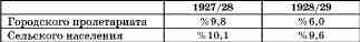 Отсюда видно, что темп роста доли лиц наемного труда в национальном доходе страны снижается с каждым годом, а в 1928/29 г., согласно расчетам ЦК, не увеличится вовсе. Темп роста абсолютной величины доходов городского пролетариата меньше, нежели темп роста доходов сельского населения. Согласно тем же К[онтрольным] Ц[ифрам], денежный доход лиц наемного труда в городе и сельского населения по отношению к предыдущему году увеличивался таким образом (в %%).
