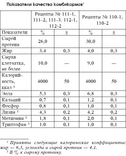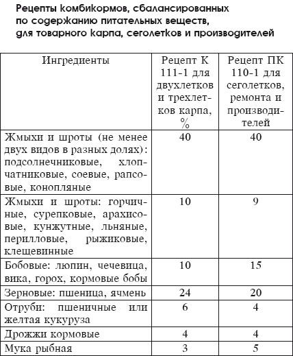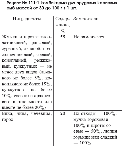 Рецепт комбикорма представляет набор кормовых средств в соотношениях, определяемых на основе современных данных потребности рыб в питательных веществах. Рецепты комбикормов для прудовых карповых рыб разработаны с учетом кормления различных возрастных групп карпа. Так, рецепты № 110-1 и 110-2 разработаны для кормления карпа от двухнедельного возраста до достижения массы 30 г в 1 шт. Рецепты № 111-1, 111-2 и 111-3, соответственно, предназначены для кормления карпа от 30 до 1000 г в 1 шт., а рецепты № 112-1 и 112-2 – для кормления карпа, имеющего массу выше 1000 г на 1 шт.