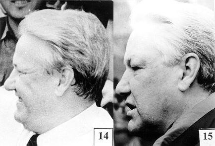 У Ельцина была более округлая голова (фото № 14), а у его двойника она приплюснута с затылка, У Ельцина выдвинута вперед («волевая») челюсть. Но главное не это. У них разные уши.