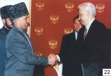 Вот в «Завтра» (№ 35, 1997) мой друг А.А. Проханов горько сетует, что «Ельцин принял в Кремле Масхадова и заявил о независимой, свободной Ичкерии!» Полно. Александр Андреевич, чего печалиться? Ведь достаточно взглянуть на фотографию, запечатлевшую само событие.