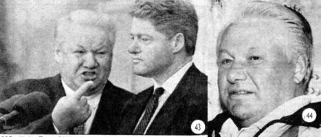Во-вторых, на фотографиях «довыборных» Ельцин выглядит гораздо старше и менее здоровым, чем на «послевыборных». Более того, на «свежих», неархивных фото с 1991 по апрель 1996 года наблюдается естественный процесс старения объекта. Последний снимок из этого ряда фотографий – фото № 48, сделанное во время первой предвыборной встречи Бориса Николаевича с «деятелями российской общественности». Рядом с ним, и это важно, Коржаков. Такой «естественный» Ельцин представлен на фото № 41, 42, 43, 44, 48 и 50. Наряду с такими фотографиями публиковались снимки прошлых лет, а также снимки более «молодых Ельциных». Зато с июля 1996 года наблюдается процесс необъяснимого изменения внешности объекта. В это время «свежие» снимки Ельцина почти не появляются в печати, нет его и на телевидении. А если Президент и позирует фоторепортерам, то либо спиной, как на фото № 46 (подпись в «МН» гласит: «Передышка. До инаугурации Бориса Николаевича остался месяц»), либо в нестандартных ракурсах, как на фото № 47 – единственной подлинной фотографии с инаугурации 1996 года, где спортивного вида худощавый человек снят почти сзади на фоне чрезвычайно серьезных Селезнева и Строева. «Второе пришествие» Ельцина начинается после операции на сердце. Фото who посвежевшего объекта (№ 49) появляются через две нетели после операции, а 17 декабря, всего через месяц с небольшим после нее, Президент РФ уже встречается с «другом Билом». Самым интересным представляется комментарий Наины Иосифовны, заявившей, что «Борис Николаевич через 12 дней (!) после операции сходил в сауну на 5 минут (!) и смыл все свои болячки (!!!)» («Известия», 21 ноября 1996 года). Будто не 66-летний человек перед нами, еще недавно обладавший целым букетом болезней, с. сказочный Иван-царевич какой-то, искупавшийся в кипящем молоке! И чудо произошло – достаточно сравнить Ельцина на (фото № 44 с ним же на фото № 55, или, скажем, на фото № 50 и № 51. Это просто другой человек! Наш Президент словно родился заново.