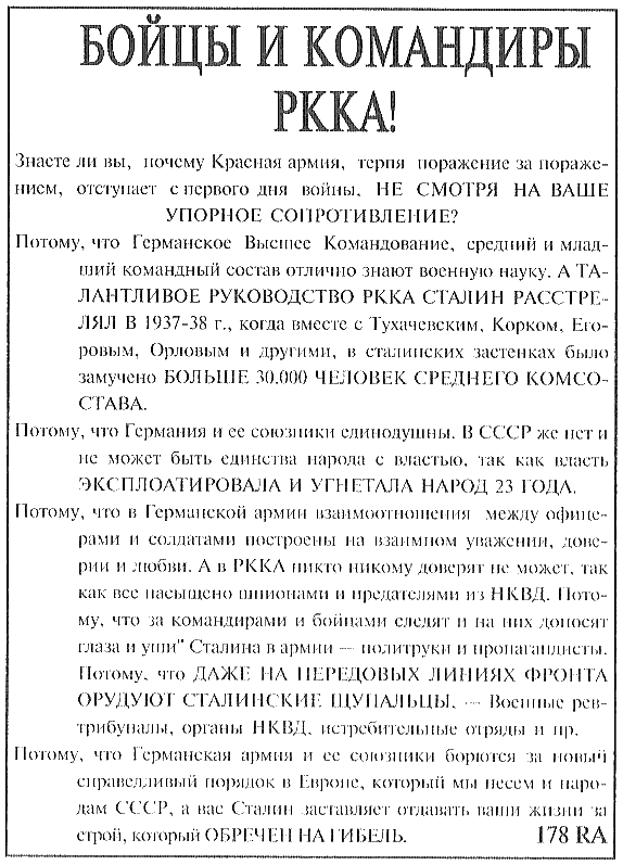 Просматривая пропагандистские листовки, которые немцы сбрасывали на наши войска в 1941 г., прихожу к мысли, что «перестройщики» в конце 80-х – начале 90-х годов в своей антисталинской пропаганде не выдумали ни единой собственной пропагандистской идеи. Все их идеи – точное повторение немецкой боевой пропаганды. Более того, все их новшества по сравнению с Геббельсом опровергаются даже за рубежом, и даже не очень сильными историками. Скажем, по поводу того, что накануне войны в Красной Армии не было военного заговора, немецкий историк Пауль Карель, сообщая о докладе Хрущева на XX съезде КПСС, пишет: