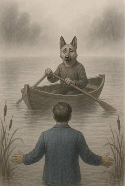 …Перед глазами Прохора показалось озеро в тумане. Затем деревянная лодка и стоящая на ней собака ростом с человека в залатанной фуфайке. Псина, гребя веслом, казалось, удивилась встрече не меньше самого Му-му…