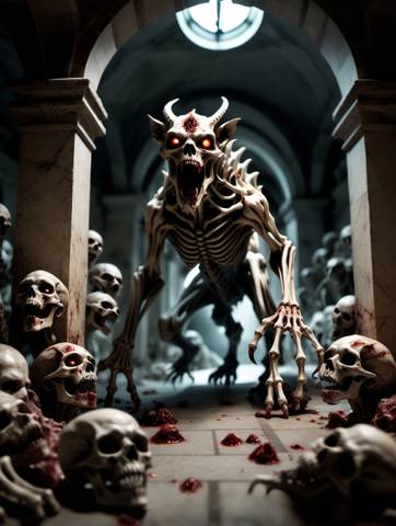 В свет фонарей вползла составленная из костяков химера, собравшая в себя десятки обитателей склепа и нарастившая мощный костяной каркас. Вместо хвоста, сзади торчала третья лапа, которой она помогала себе передвигаться, неловко заваливаясь то на один, то на другой бок. Костяные рога и мясистый кровавый нарост по центру черепа с горящими красными глазами завершали устрашающий образ твари.