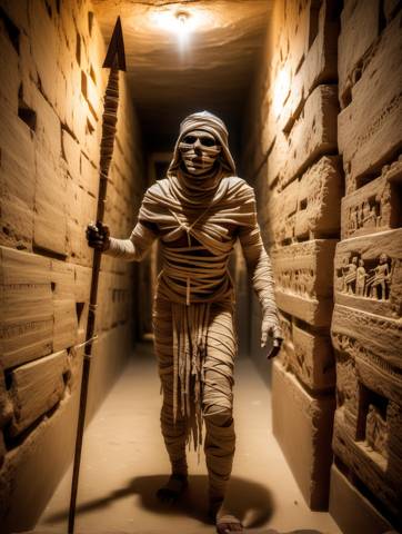 Старая, ссохшаяся забинтованная в какие-то обноски мумия, с копьем в руке, по узкому коридору медленно шагала навстречу приготовившимся родителям. Пес, первый заметивший угрозу, подскочил ближе и решив реабилитироваться за големов, ударил молнией во врага. Протянувшийся от собаки разряд электричества перед головой противника вильнул и вонзился в металлическое навершие копья, бессильно заземлившись на него. Легкий дымок на руке и слегка тлеющая ткань, вот и весь результат атаки.