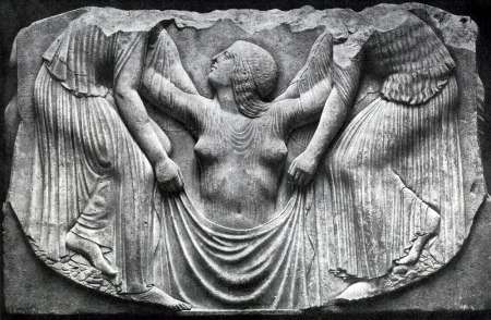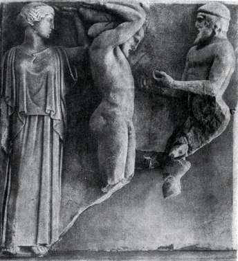 Ярким примером переосмысления привычных мифологических сюжетов в годы радикальной ломки традиций архаики и становления искусства классики является замечательный рельеф, исполненный, вероятно, также ионийским мастером второй четверти 5 в. до н.э. и изображающий рождение Афродиты из пены морской (так называемый «Трон Людовизи»); на боковых сторонах этого мраморного «трона» или, скорее, постамента для статуи Афродиты изображены обнаженная девушка, играющая на флейте, и одетая в длинную одежду женщина перед курильницей. Ясная и простая гармония, спокойная естественность движений фигур и реалистическая жизненность их группировки резко отличают эти произведения от архаических рельефов.