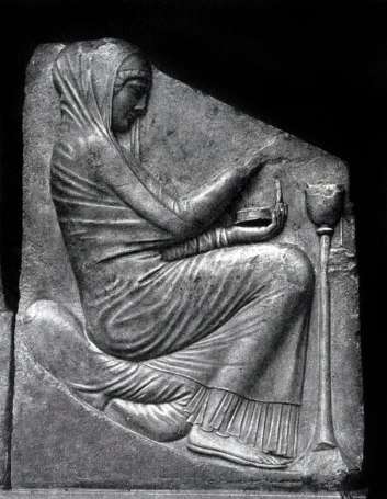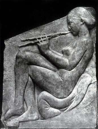 Изображенные по сторонам от центральной группы сидящая нагая девушка, играющая на флейте, и женщина, закутанная в плащ и совершающая воскурение богам, композиционно почти тождественны друг другу. Однако вся группа далека от чисто декоративной орнаментальной симметричности архаической композиции. Фигуры объемны и трехмерны, они даны в естественных и свободных позах. Сидящая девушка непринужденно откинулась назад. Одна нога ее закинута на другую, чем особенно подчеркивается реальная пространственность рельефа. Ее фигура полна изящества. Пальцы легко и быстро скользят по флейте. Поза сидящей молодой женщины – жены и матери, хранительницы домашнего очага – строже, неподвижнее, движение рук спокойно и размеренно. Обе эти фигуры, в своем различии воплощающие разные стороны красоты и любви, как бы объединены образом Афродиты, под чьей властью они равно находятся и разные стороны служения которой они обе воплощают. От механического сочетания фигур, имевших отвлеченно-символический характер, искусство обратилось к целостному, органическому и живому художественному образу, в котором были воплощены основные этические и эстетические представления.