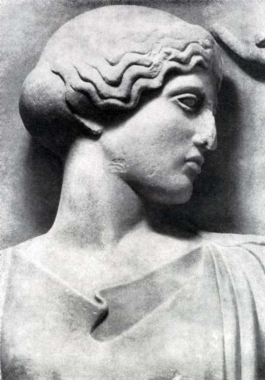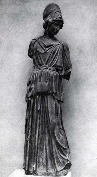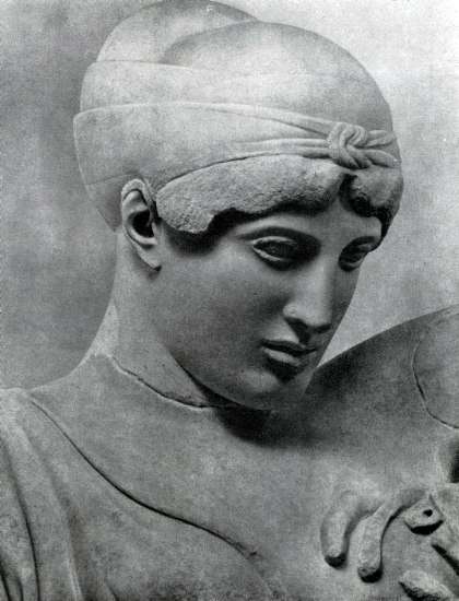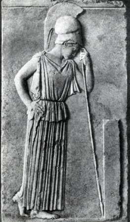 К произведениям, родственным по духу искусству Мирона и образующим переход от фронтонов Олимпии к искусству высокой классики, относится рельеф аттического мастера, изображающий Афину, опирающуюся на копье (около 460 г. до н.э. .