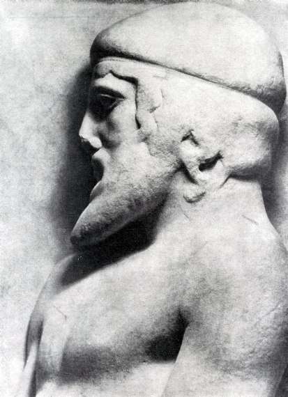 151. Голова Атласа. Фрагмент метопы храма Зевса в Олимпии. См. илл. 149а.