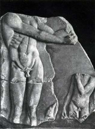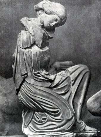 148 а. Женщина, схваченная кентавром за волосы, с западного фронтона храма Зевса в Олимпии. Мрамор. 460—450 гг. до н. э. Олимпия. Музей.