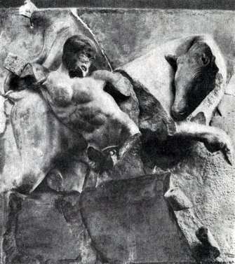 Очень выразительна метопа, посвященная борьбе Геракла с Критским быком. Перекрещивающиеся разно направленные движения Геракла и быка создают устойчивую композицию, вписанную в квадрат метопы; движения этих фигур совпадают с диагоналями квадрата и тем самым включаются в общую систему геометрических отношений и пропорций, характерных для архитектурного сооружения. Вместе с тем строгое равновесие композиции нисколько не помешало скульптору утвердить победу человека: свободное и смелое движение Геракла полно энергии и стремительности, сила и воля героя торжествуют над мощью быка.