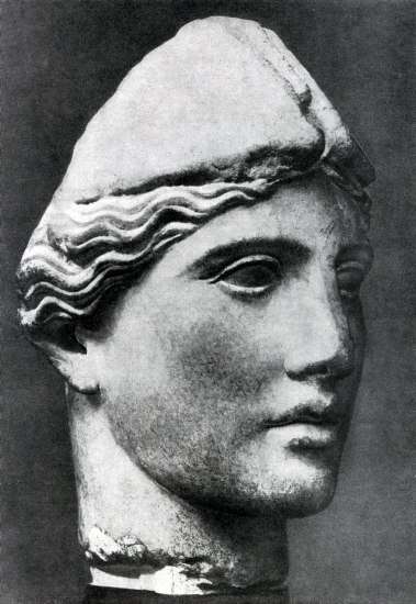 150. Голова Афины. Фрагмент метопы храма Зевса в Олимпии. См. илл. 149а.