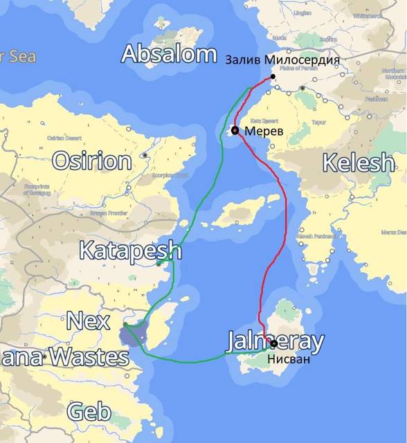 Проводив взглядом пылающий корабль, на котором в своё последнее плавание отправились моряки из Залива Милосердия, и, перетасовав команды так, чтобы на каждом корабле не было недостатка в матросах, я приказал продолжить плавание. Путь до Нисвана занял почти неделю, и то, только из-за того, что недалеко от берегов Джалмерэе нас вновь настиг шторм, благо заранее была куплена карта побережья острова, и удалось укрыться от непогоды в достаточно большой, но с очень узким входом, бухте.