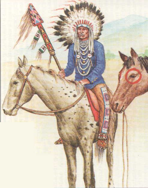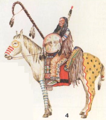 Член общества вождей «Белые Кони». Экипирован «кривым копьем», щитом, а также Священной Трубкой, которая хранится в сумке, и священным головным убором, хранящемся в цилиндрическом футляре.