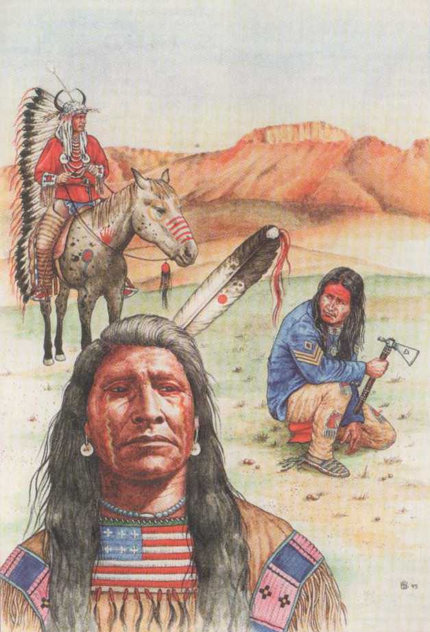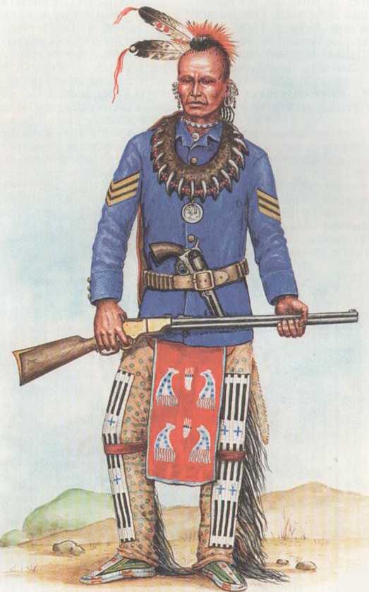 Все индейцы Великих равнин участвовали в межплеменных войнах, но далеко не все сражались против правительственных войск. Часть индейцев служила наемными разведчиками, или скаутами, в чьи обязанности входило выслеживать враждебные племена, показывать путь в незнакомой солдатам местности, поддерживать в бою основные силы регулярной армии. Скауты получали жалованье 13 долларов в месяц и носили военную форму (правда, порой весьма причудливую – в ней преобладали элементы традиционного воинского костюма индейцев); они были вооружены револьверами и винтовками, разбиты на отделения и роты. Офицерами в подразделениях скаутов обычно были белые, а младшими командирами – сержантами и капралами – индейцы. Небольшие армейские соединения – эскадрон кавалерии или рота пехоты – обходились одним-двумя скаутами, в полку могло быть отделение скаутов, а во время больших кампаний иногда задействовали роту или больше индейских разведчиков. Например, во время экспедиции генерала Коннора против племен реки Паудер (Сиу, Чейенны, Арапахо) участвовала рота скаутов Пауни (95 человек) и столько же скаутов Омаха и Виннебаго.