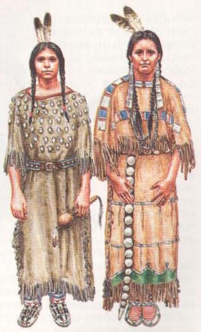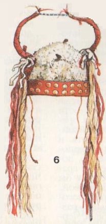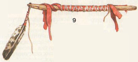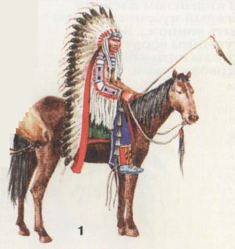 – головной убор из шкурок горностая и рогов бизона, мокасины, леггины, рубаха, краска, трубка, изогнутый шест.