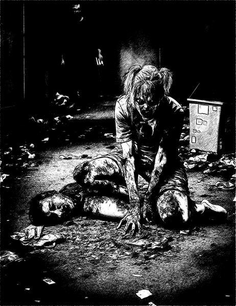 Заметив, что дочка сбежала, Андрей оглянулся. Тусклый свет откатившегося в сторону фонарика позволил увидеть молчаливую, шелестящую одеждой и неверными шагами толпу, неотвратимо надвигающуюся из темноты. Идущие в первых рядах зомби начали поднимать руки и щёлкать челюстями, послышалось сдавленное сипение воздуха, выходящего из лёгких мертвецов.