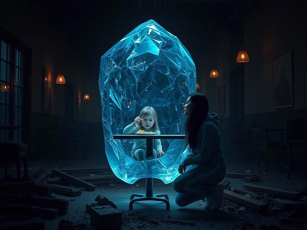 Она медленно подняла голову. Чтобы не слепить её, я снял налобный фонарь и слегка отвёл луч в сторону. Глаза, огромные и бездонно-пустые. В них не было страха, только всепоглощающая боль и усталость, от которых сжималось сердце. Она молча провела тыльной стороной ладони по щеке, размазав сопли, и снова повернулась к кристаллу. Её рука, тонкая и дрожащая, поднялась и легла на мерцающую поверхность кристалла. Не поглаживая, просто касаясь.
