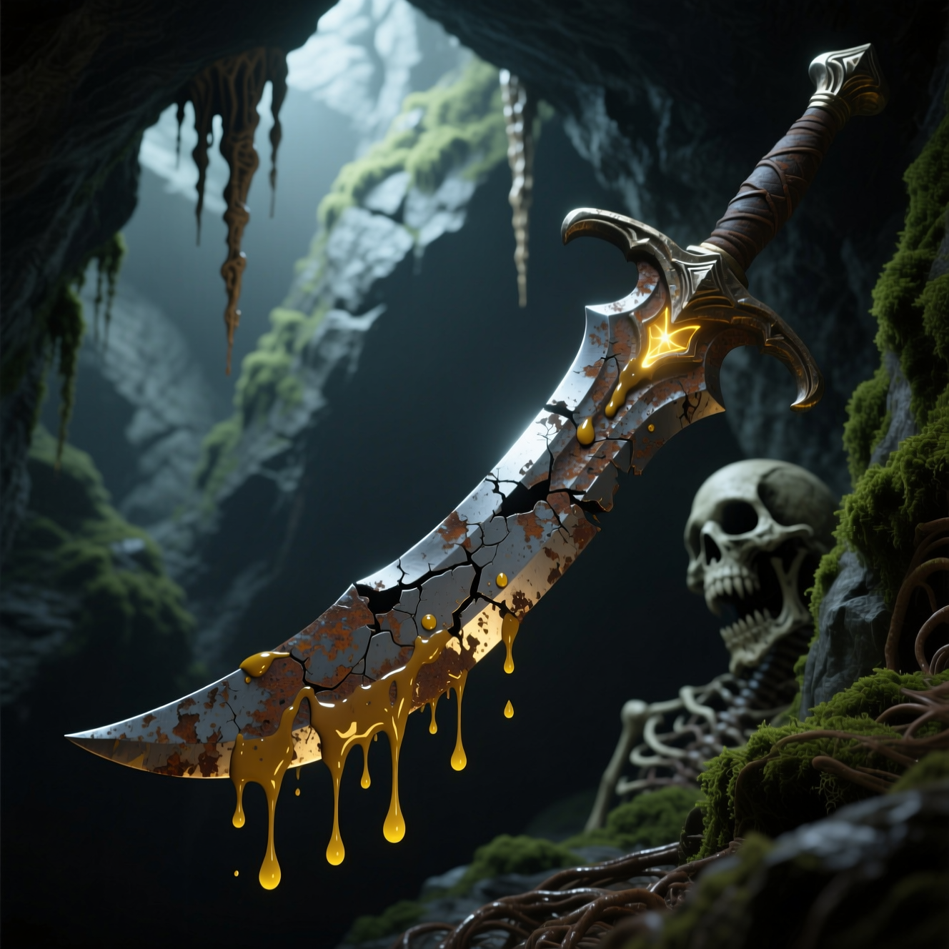Настолько красивый и настолько же отвратительный. Парадокс, воплощённый в стали. Изысканные линии клинка и тонкая работа узоров на гарде и самом клинке говорили о том, что когда-то это было произведение искусства. Но сейчас эта красота служила лишь фоном для мерзости. По всей поверхности стали зияли глубокие сколы и трещины, из которых сочилась и пульсировала густая, маслянистая жижа желтоватого цвета с оттенками ядовитой зелени. От него пахло сладковатой гнилью и окисленным металлом. Рука сама потянулась к рукояти – браться за лезвие не было ни малейшего желания. Кожа на ладони ощутила неприятное, живое тепло, исходящее от клинка.