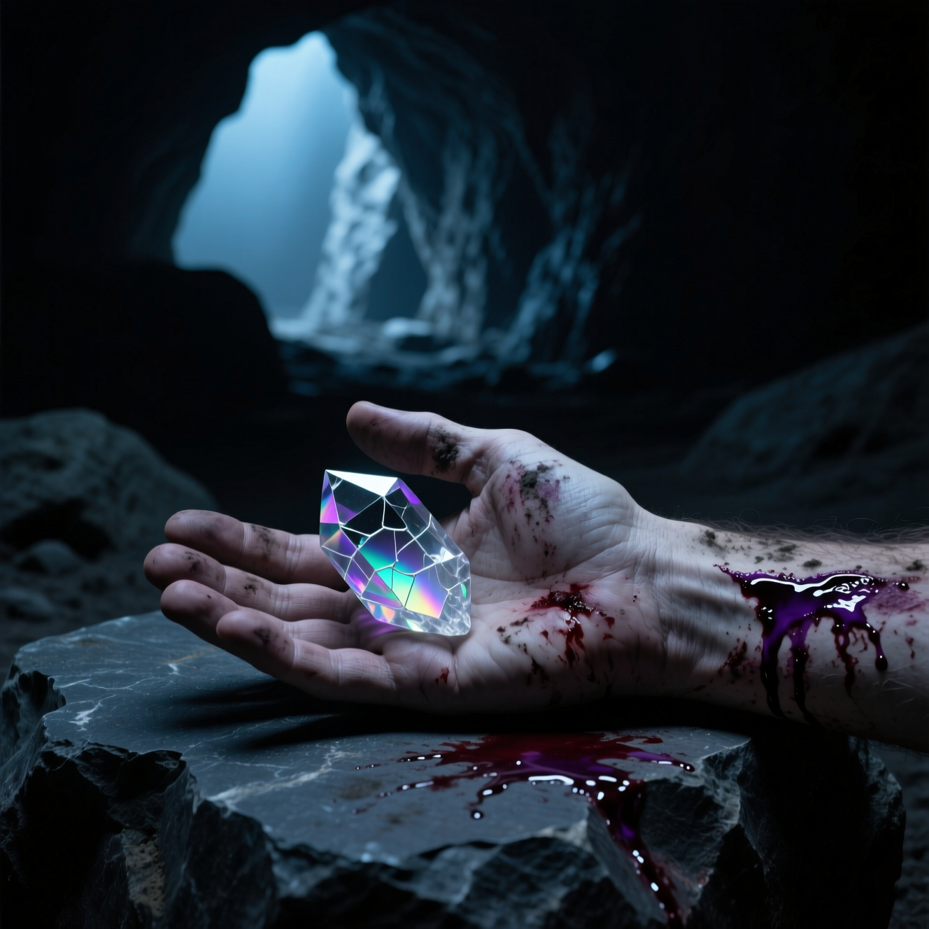 Вторая попытка тоже оказалась неудачной, но теперь я заранее очистил примерное место приземления, заодно пособирав все монетки и карты. И лишь с третьей попыткой магическая нить обвила кристалл на потолке, и с небольшим усилием при падении я вырвал этот кристалл из камня. В этот момент артефакт потух, погрузив грот в кромешную темноту. Мне же потребовалось несколько секунд, прежде чем мои глаза засветились белым светом, и я смог разглядеть лежащий в руке кристалл необычной формы. Лишь маленький огонёк из глубины кристалла слегка освещал мою грязную ладонь с частицами чужой крови.