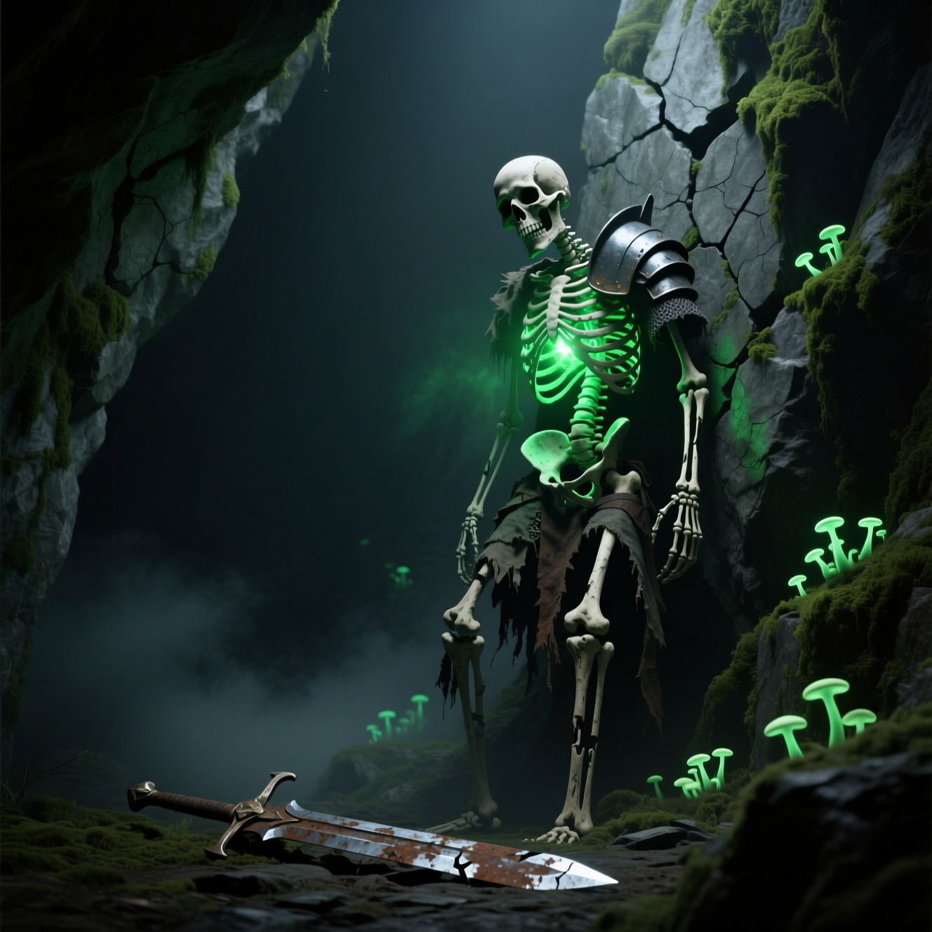 Четверо скелетов распались на косточки, и лишь один, уронив свой меч, прислонился спиной к стене, опустив голову, как уставший солдат. Его кости были в трещинах, и лишь на одной воле он стоял на ногах.