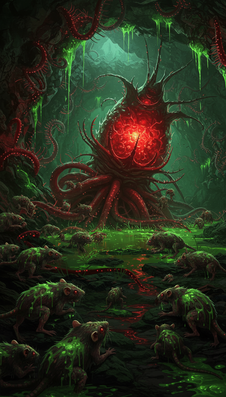 И вот мы вышли в длинный продолговатый грот. Не такой, как остальные громадные залы, которые я встречал на предыдущих точках испытаний. Всюду зелёная слизь и корни. На стенах, на потолках, на полу – сплошные лужи слизи, в которых барахтались и измазывались сотни зомби-крыс. Но это не главное. Самая мерзость – это огромное отвратительное растение, светящееся красным цветом прямо из центра. Бутон, из которого исходили сотни корней и источала слизь, выходящая из множества маленьких усиков. Растение слегка колыхалось и, как сердце, то сжималось, то разжималось.