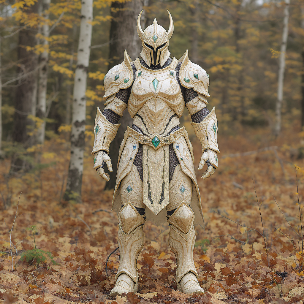 Этот доспех кажется вырезанным из светлой, почти белой древесины сакрального дерева. По его поверхности переливается сложный узор, похожий на годичные кольца, и мерцают вкраплениями похожие на изумруды спящие почки. Он источает слабый аромат цветущего сада и свежей хвои.