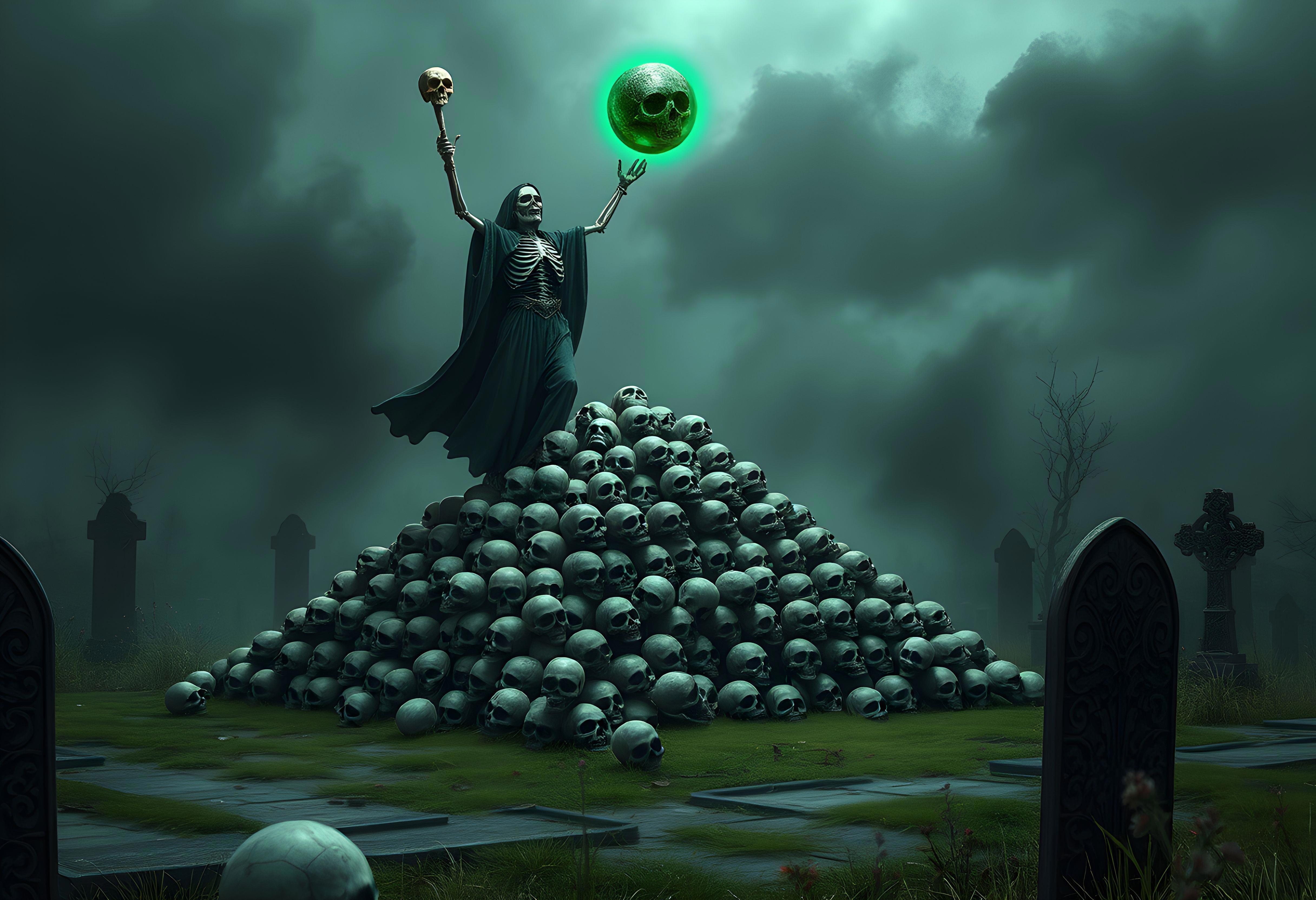 В самом центре, на чьей-то могиле, была построена пирамида из черепов и ещё свежих отрубленных голов. Отвратительное зрелище. Высота пирамиды была по грудь обычного человека, а над ней пульсировал тёмно-зелёный магический шар шириной около полуметра. Именно из пирамиды выходил этот зловонный туман, который стелился по земле, а далее поднимался до десятка метров в высоту.