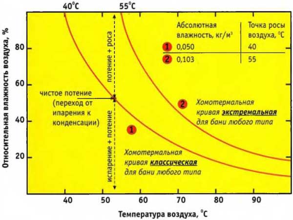Многие люди, в том числе и некоторые врачи, по наивности полагают, что климатические режимы различных традиционных парных бань специально разработаны «многовековым опытом многочисленных поколений предков». Это глубочайшее заблуждение. Других режимов, помимо приведенных в теоретической хомотермальной таблице, просто не существует в природе. Все, что ниже хомотермальной кривой, соответствует режимам потоотделения (в сочетании с потением). Все, что расположено на хомотермальной кривой, соответствует режимам потения без испарения пота и без осаждения конденсата. Все, что выше хомотермальной кривой, соответствует потению и осаждению горячего конденсата (росы) – классический случай русской паровой бани с кратковременным гипертермальным воздействием на кожу.