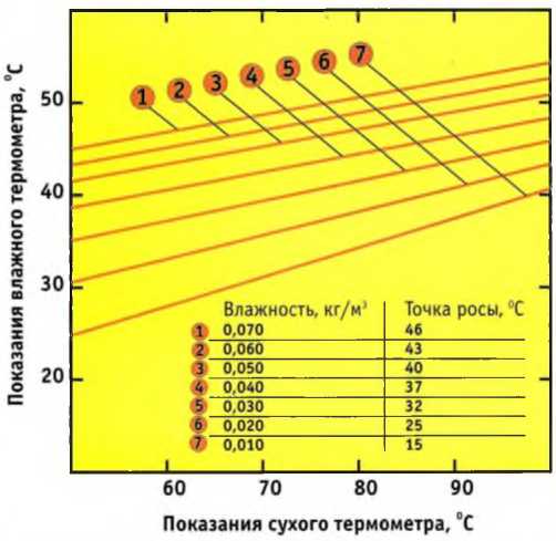 Еще более точный метод оценки абсолютной влажности (но, к сожалению, довольно сложный) – определение точки росы, которая при абсолютной влажности 0,05 кг/м3 составляет ровно 40 °C. Во всяком случае, при проектировании стен бани надо исходить из точки росы 40 °C.