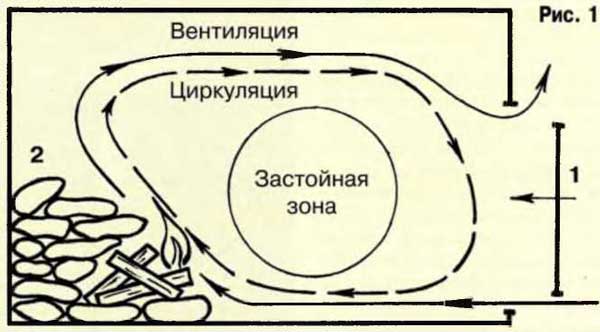 Чтобы прояснить суть вопроса, рассмотрим частный, но очень наглядный пример черной бани (дымной сауны, схема которой представлена на рисунке 1). При протоке черной бани холодный воздух поступает снизу из открытой двери 1 по полу в очаг 2, вступает в химическое взаимодействие с дровами (горение), нагревается, в виде горячих дымовых газов поднимается вверх, расстилаясь по потолку, выходит наружу через верхнюю часть двери. Такая аэродинамическая траектория называется вентиляционной приточно-вытяжной кривой и является разомкнутой (вернее замыкающейся вне помещения). Если временно прикрыть дверь 1, то потоки воздуха отнюдь не исчезнут, поскольку причиной их возникновения является очаг, нагревающий воздух Получившаяся при закрытых дверях траектория движения воздушных масс (в том числе и дымовых) называется циркуляционной (или, как иногда говорят, рециркуляционной) кривой и является замкнутой. Именно циркуляционные потоки приводят к задымлению помещения, а также к нагреву стен и полов нисходящими потоками горячего воздуха (дымовых газов). В реальных условиях циркуляционные и вентиляционные потоки воздуха обычно сосуществуют одновременно. Причем для понимания банных процессов главным является циркуляционный поток. Только зная его траекторию в каждом конкретном помещении, можно расположить приточные и вытяжные отверстия таким образом, чтобы полностью «разомкнуть» при необходимости циркуляционную кривую и тем самым организовать эффективную вентиляцию. Кроме того, в помещениях бань обычно имеется одна или несколько застойных зон (в том числе под полками), движение воздуха в которых может быть создано лишь дополнительными факторами (передвижением людей, взмахами веников, вентиляторами и т. п.)