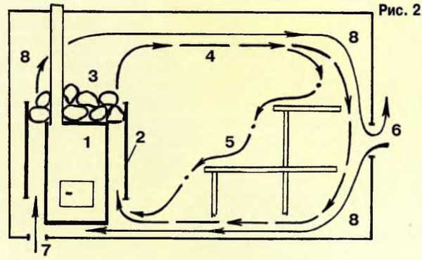 Посмотрим, как это выглядит в цифрах. В качестве исходной модели выберем схему современной сухой финской сауны (рис. 2). Сауна содержит вместо очага металлическую печь с топливником 1 (на твердом, жидком или газообразном топливе или электрический) с металлическими экранами 2 (кожухом), образующими калориферный нагреватель воздуха и, как правило, засыпку камней сверху 3 (каменку). Раскаленный иной раз и докрасна топливник создает в помещении замкнутый циркуляционный поток воздуха 4, распространяющий в объеме бани тепло от топливника и пар от каменки. Наличие полок (отодвинутых от стен или придвинутых, имеющих щели или не имеющих) и других преград видоизменяет траекторию замкнутых циркуляционных потоков 5, а наличие вентиляционных отверстий 6 и 7 размыкает (полностью или частично) циркуляционные потоки 8.