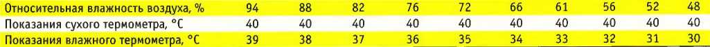 Испарение воды является механизмом охлаждения и в неживой природе. Проведем следующий эксперимент. Нагреем баню до 40 °C, поместим в нее два обычных стеклянных спиртовых капиллярных термометра и обмотаем нижние резервуары термометров ватой. Один из термометров назовем сухим, а другой, смочив на нем вату водой, влажным. Снимем показания обоих термометров при разных относительных влажностях воздуха в бане и получим следующую таблицу, которая известна каждому метеорологу и называется психрометрической (таблица 1).