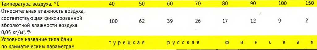 Вышеприведенная хомотермальная таблица, полученная простейшим расчетным путем, практически в точности описывает реальные климатические условия парных бань всех возможных типов – турецких, русских, финских… Для всех бань характерна одна и та же критическая абсолютная влажность порядка 0,05 кг/м3, что с первого взгляда просто крайне удивительно. Не менее удивительно и то, что все известные климатические условия бань могут быть достигнуты в конструкции типа простой турецкой бани.