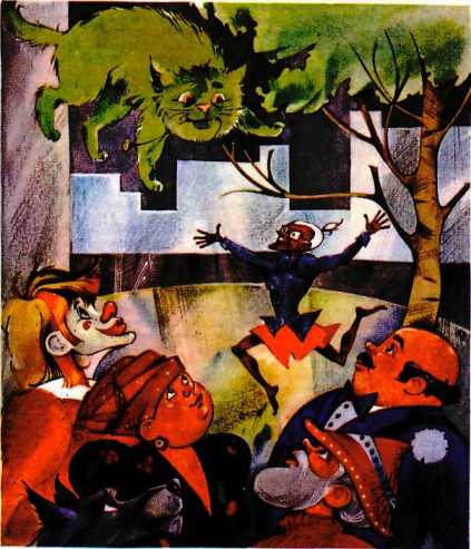…Вот какую удивительную картину наблюдали прохожие на улице. Верхом на троллейбусе сидел кот непонятного цвета. Он небрежно помахивал хвостом и свысока смотрел на растрёпанную полуодетую старуху, которая во весь опор скакала за троллейбусом. За старухой, шумно хлопая мокрой юбкой, бежала тётка, размахивая красной спортивной сумкой…
