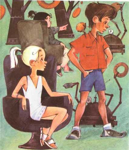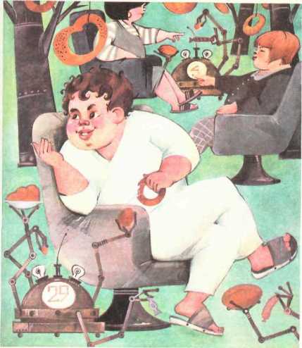 А в садовых аллеях, в удобных низких креслах сидели толстые мальчики и девочки. Они старательно жевали булочки и котлетки, по очереди приказывая машинам: