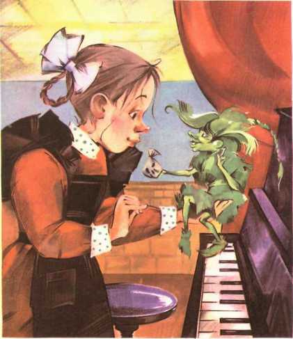Но Кате любопытно: можно ли на этом инструменте сыграть знаменитую песенку про Антошку и картошку?.. Она нажимает сломанную клавишу… Раздаётся отвратительный дребезжащий звук, с которого не может начаться ни одна хорошая песенка.