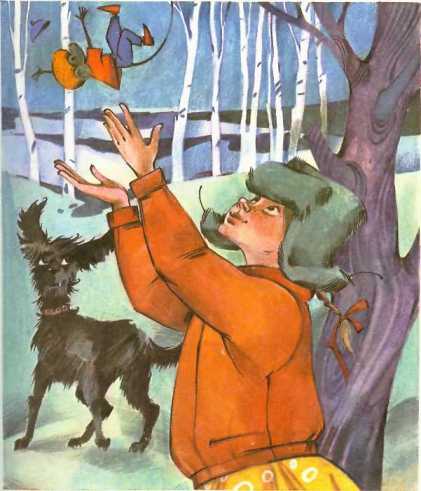 Черныш бежал к высокой берёзе, а за ним, едва поспевая, проваливаясь в остатки рыхлого мокрого снега, торопилась Гутя.