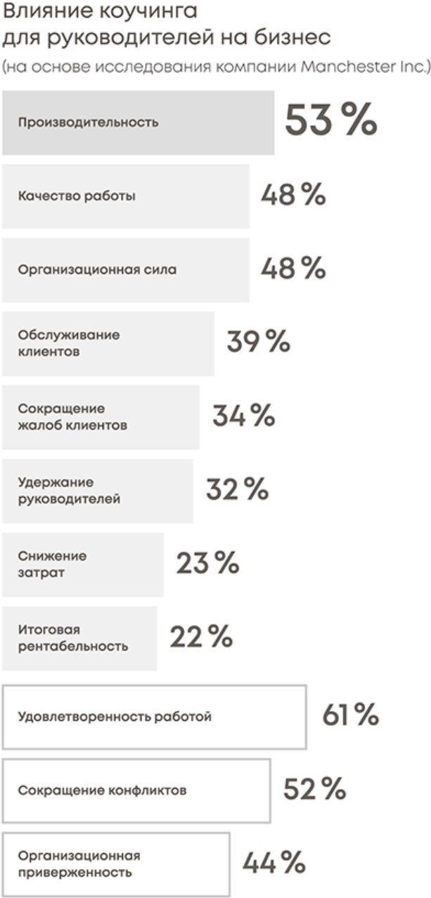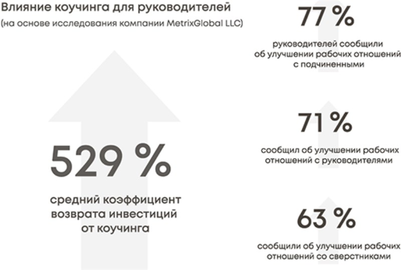 MetrixGlobal LLC, специализирующаяся на решениях для измерения производительности бизнеса, еще в 2001 году провела опрос руководителей компаний из списка Fortune 500, которые прибегали в своей работе к услугам коучей. После сбора и анализа данных оказалось, что средний коэффициент возврата инвестиций от коучинга составил в среднем 529 %. То есть каждый доллар, вложенный в оплату услуг коуча, приносил компании больше пяти долларов чистой прибыли. Но это оказалось не единственным результатом работы: