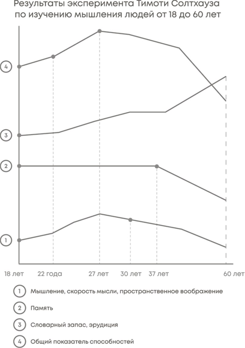 Профессор Тимоти Солтхауз из университета Виржинии выяснил, что с возрастом увеличиваются способности, основанные на накопленных знаниях, в то время как мышление, скорость мысли и пространственное воображение начинают постепенно ухудшаться ближе к тридцати годам.
