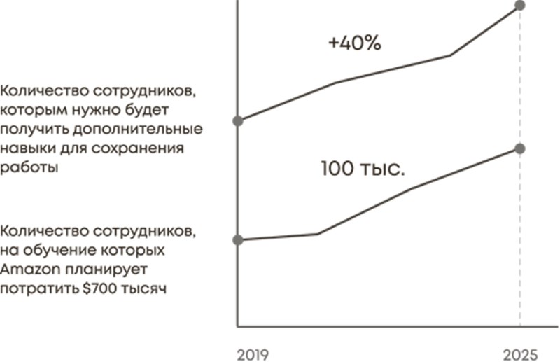 Многие крупные компании поддерживают своих сотрудников в этом. Amazon в 2019 году объявил, что к 2025 году планирует потратить 700 миллионов долларов на обучение 100 тысяч сотрудников. В России «Сбер», «Газпром», ВТБ, «Росгосстрах», МТС и другие создают свои корпоративные университеты.