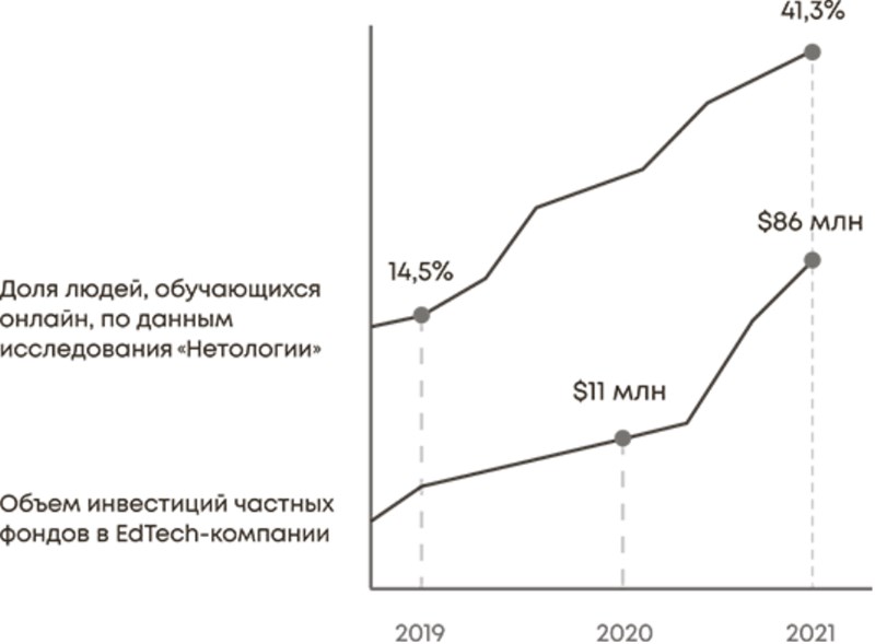 Самообразование также становится все более популярным, особенно с приходом на рынок онлайн-обучения. По данным исследования «Нетологии», доля людей, обучавшихся онлайн с 2019 по 2021 год, увеличилась почти в три раза – с 14,5 до 41,3 %. При этом инвестиции в EdTech в России постоянно растут. Так, например, в 2020‒2021 годах объем инвестиций частных фондов в EdTech-компании увеличился почти в 8 раз – с $11 млн до $86 млн.