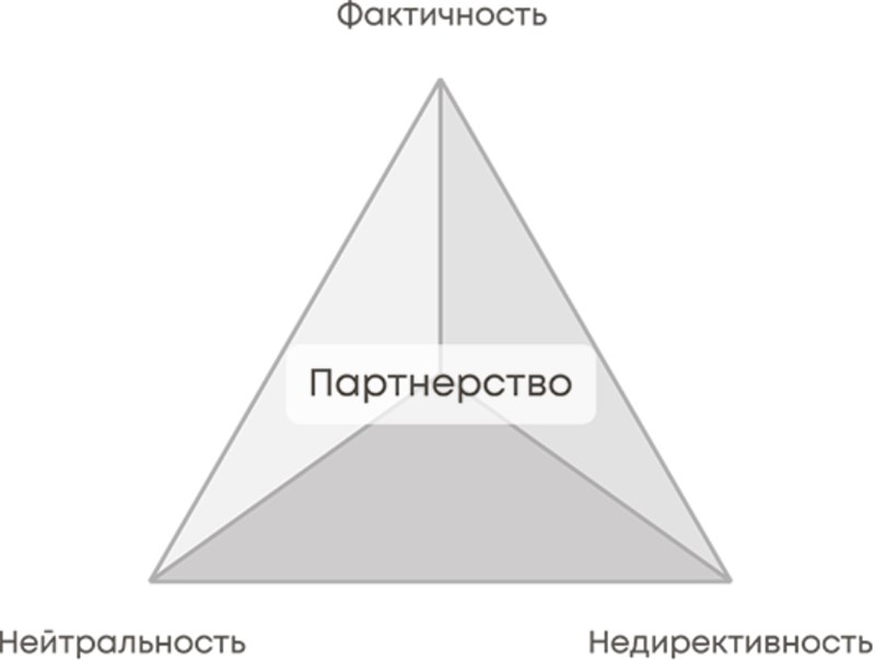 В центре этого треугольника лежит партнерство, то есть равноправные, осознанные отношения, строящиеся на основе взаимной ответственности и нацеленные на достижение наилучших результатов.