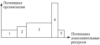 Соединение ресурсов 1, 2 и 3 дает меньший прирост потенциала, чем соединение тех же ресурсов с ресурсом 4, обладающим небольшим потенциалом. Привлечение ресурса 5 снижает потенциал организации (см. рис. 3.3).