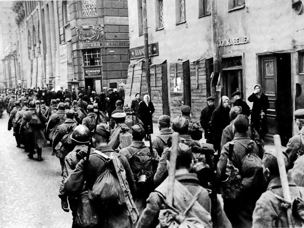 У окна стоял Пашка-танкист, смотрел на пожелтевшие деревья и улицу. По мостовой шли колонной моряки: с оружием за плечами, пулеметами и полным боекомплектом.