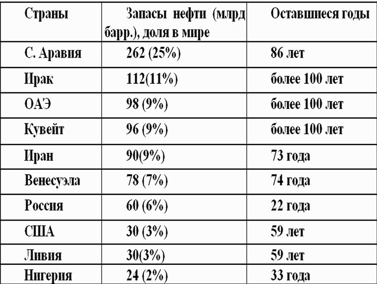 Запасы нефти (млрд барр.), доля в мире и оставшиеся годы: